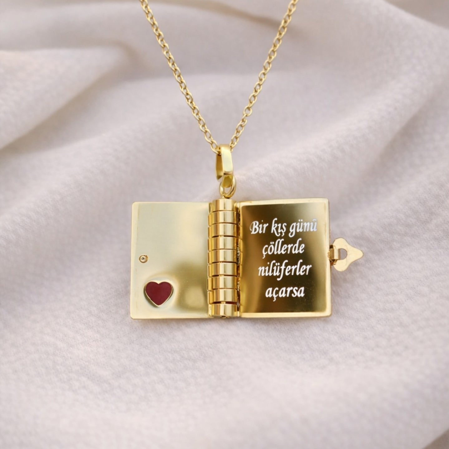 Sevdiklerinize kelimelerle anlatamadığınız duyguları taşıyan özel bir hediye… Açılabilir mini kitap tasarımıyla hazırlanan bu zarif kolye, içindeki anlamlı yazı ve kalp detayıyla aşkı, bağlılığı ve özel anları simgeler. Günlük kullanıma uygun, şık ve unutulmaz bir hatıra.